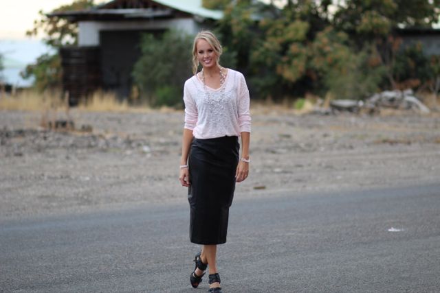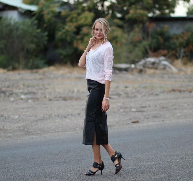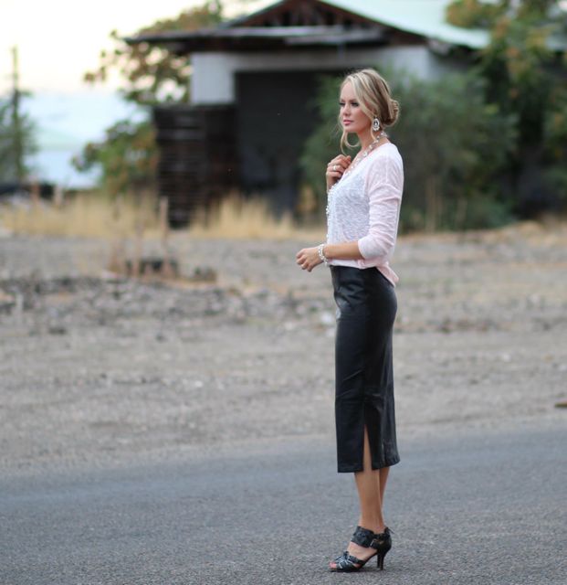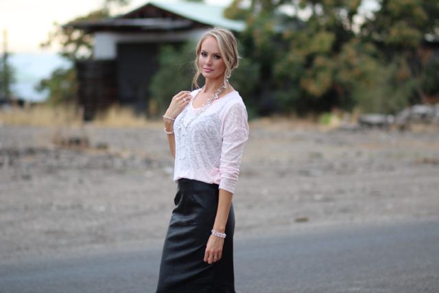 Outfit Details: Sweater: Old Navy / Leather Skirt: Kingdom and State / Shoes: Nordstrom Rack / Jewelry: Forever 21