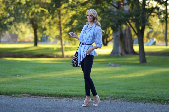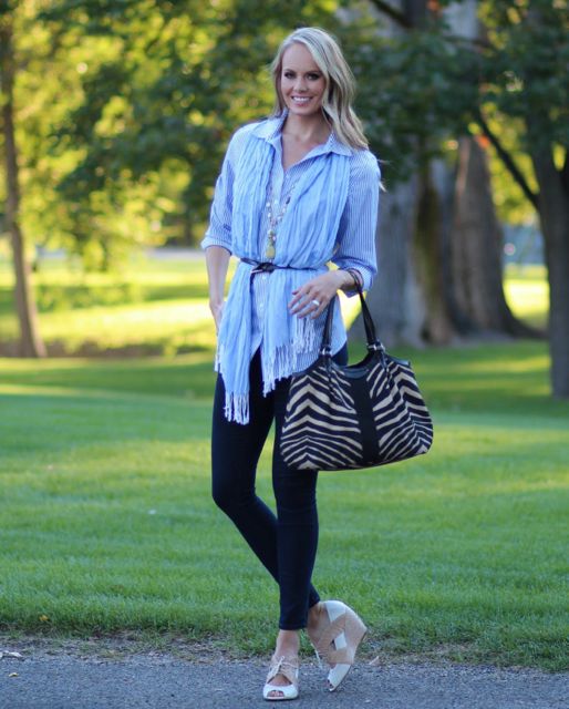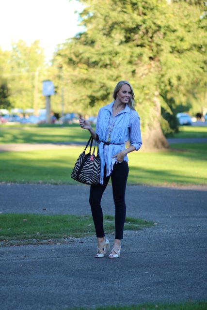 Outfit Details: Boyfriend Shirt and Necklace: Chico’s / Skinnies: Old Navy / Scarf: Target / Wedges: Anthropology / Purse: Coach
