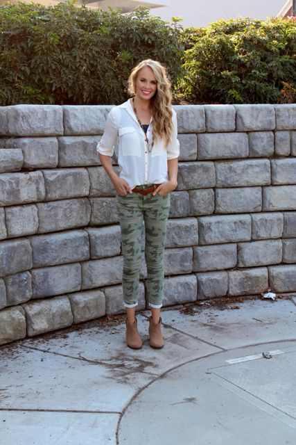 Outfit Details: Blouse: Maurices / Camo Pants: Old Navy / Belt and Necklace: Eddie Bauer / Booties: Wal-Mart