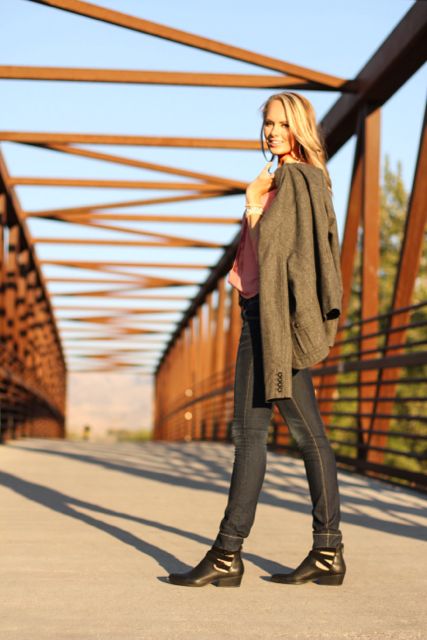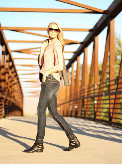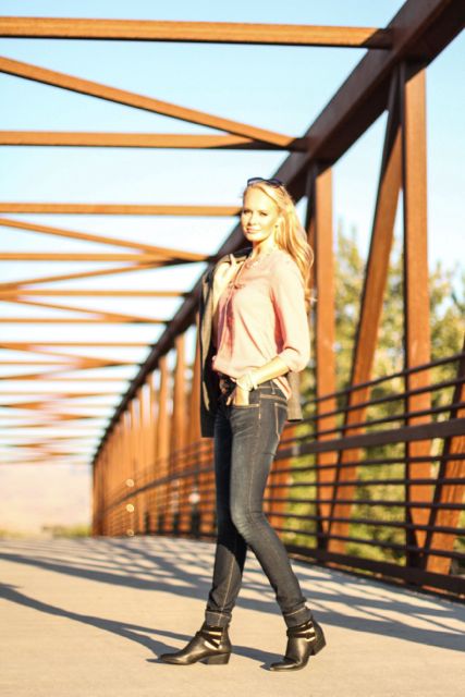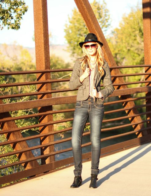 Details: Blazer:Eddie Bauer / Blouse and Hat: H&M / Jeans: Alloy (up to 37″ inseam!) / Boots: Kenneth Cole via Nordstrom Rack